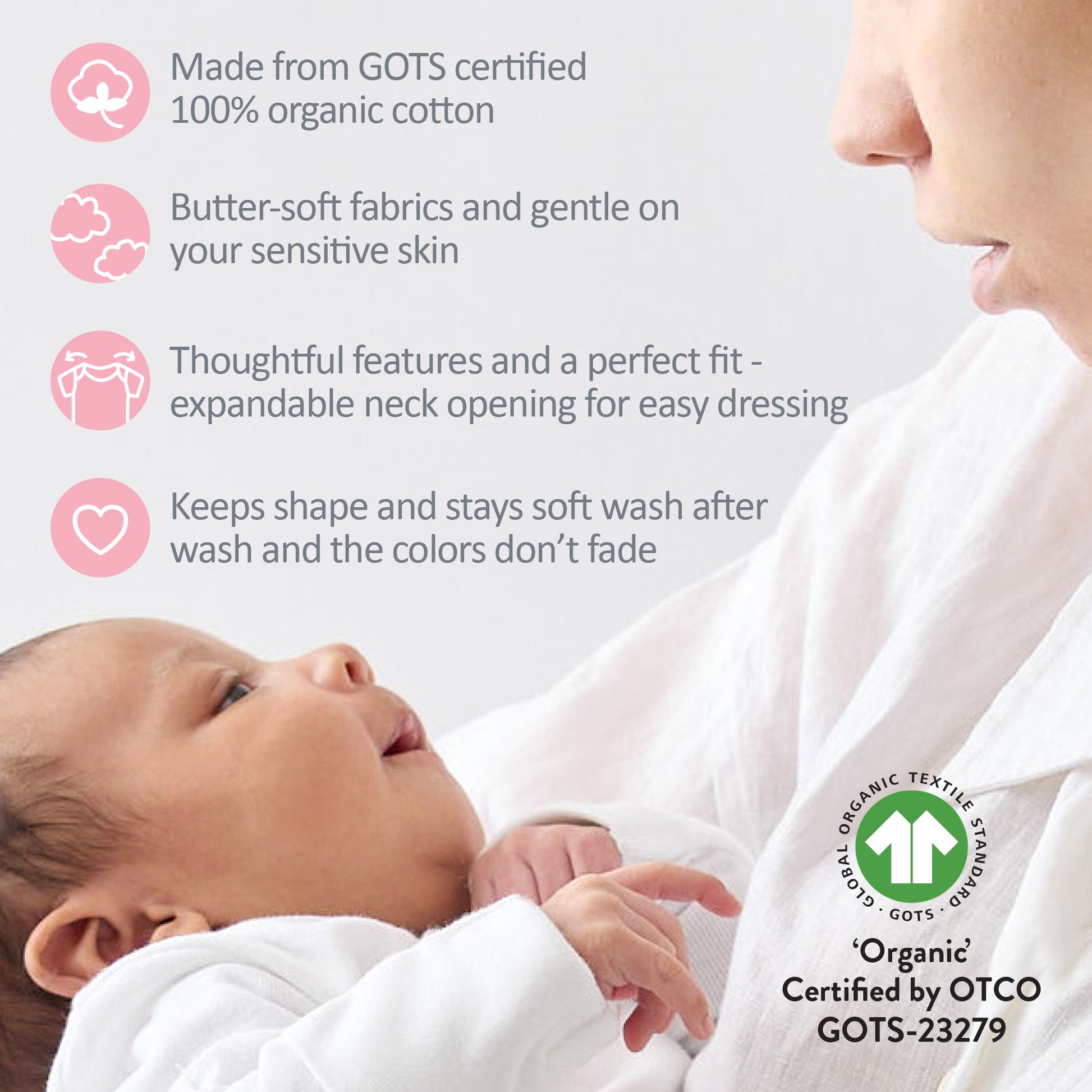 Set of colorful baby bodysuits arranged in a fan-like pattern on a white background with a pink flower and green leaf.
