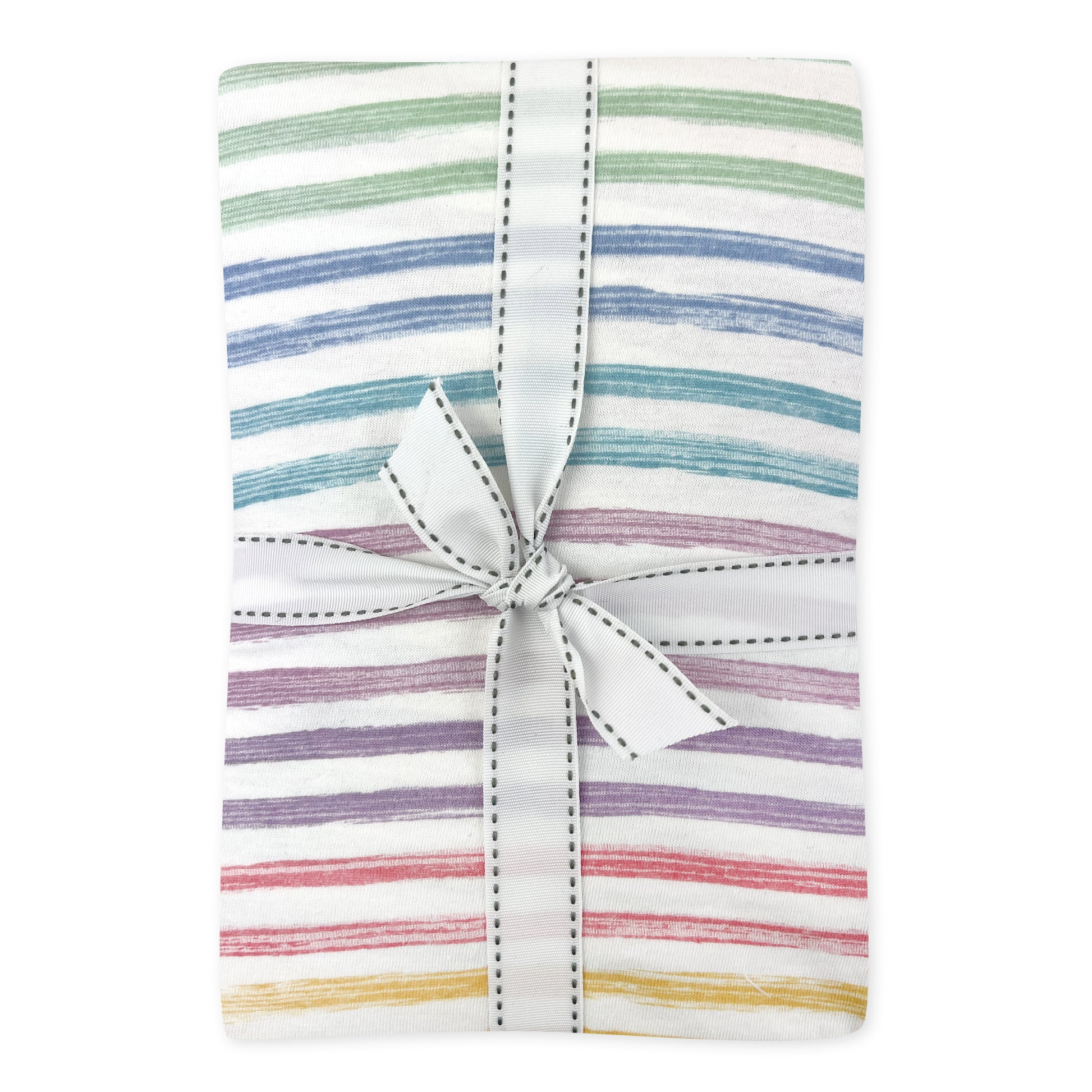 Multicolored striped baby onesie with a bow on a white background